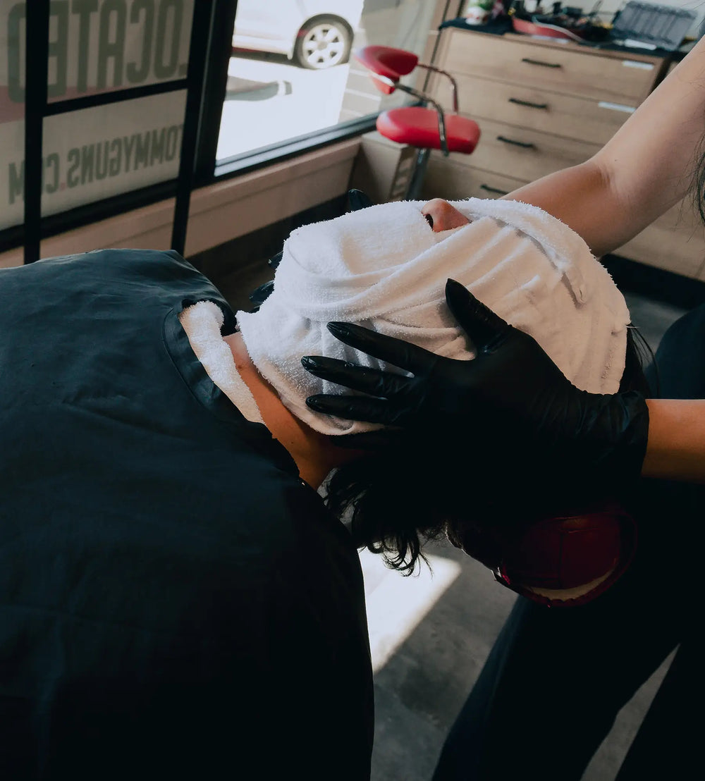 The first step is a gentle cleanse & hot towel treatment. A plant-derived, lavender, vitamin E, and coconut cleanser gently foams away oil & impurities.