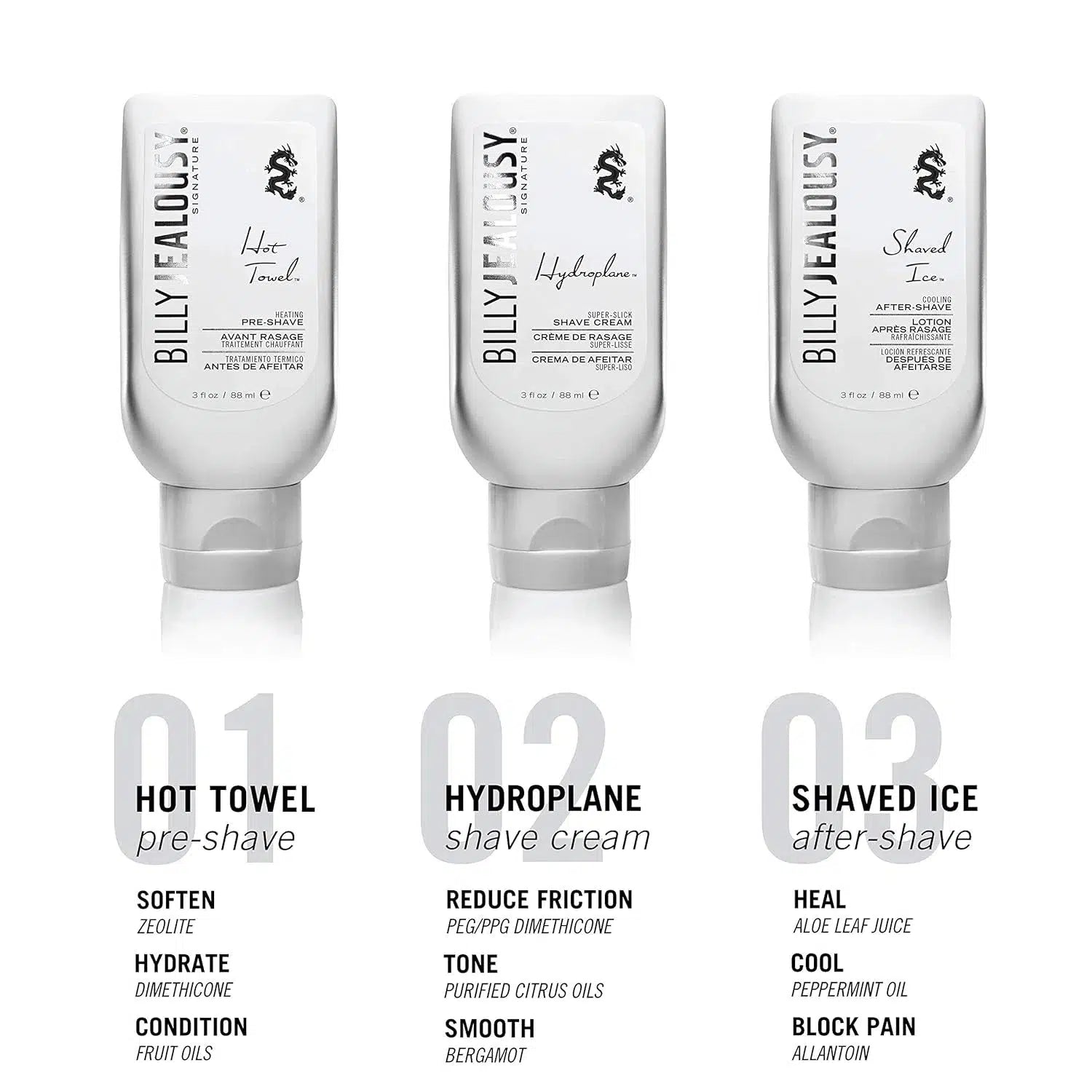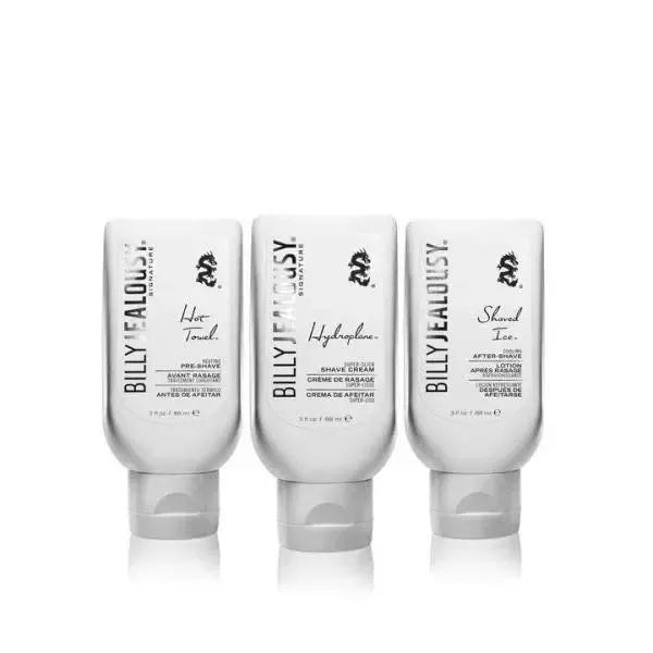 The Billy Jealousy Shave3some Shave System is for those wanting a close and comfortable shave. This kit includes the softening Hot Towel Heating Pre-Shave, the luxurious and moisturizing Hydroplane Super-Slick Shave Cream, and soothing Shaved Ice Cooling After Shave Balm for an all-around great shaving experience.