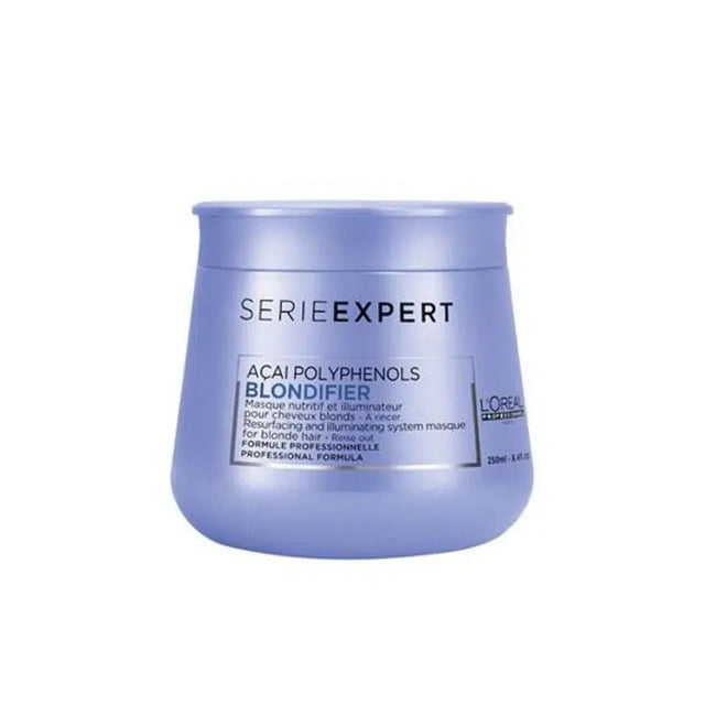 L’Oréal Professionnel Serie Expert Blondifier Nourishing + Illuminating Mask replenishes, smooths and nourishes the hair fibres to enhance the multidimensional shine and radiance of blonde hair. Enriched with Acai Berry and Brazilian Gluco Polyphenols to protect against UV damage and deliver powerful antioxidants, this restoring hair mask will neutralize yellow tines to ensure your blonde hair remains radiant and beautiful.