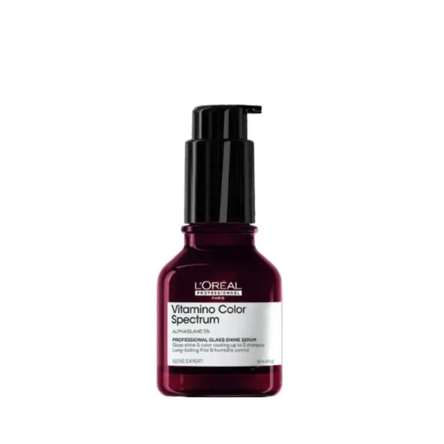 L’Oréal Professionnel Pro Série Expert Vitamino Color Spectrum Glass Shine Serum enhances colored hair with stunning shine and lasting vibrancy. This powerful leave-in serum provides 5x more glass-like shine for up to five washes, thanks to its concentrated, waterless formula with 5% alpha-silane. It activates with heat and steam, forming a protective layer around each strand, combating fading and frizz while offering superior protection against humidity and heat.