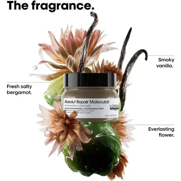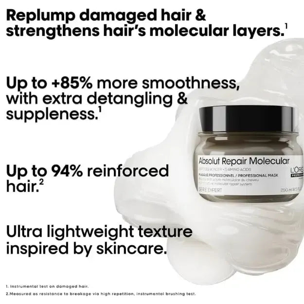 L’Oréal Professionnel Absolut Repair Molecular Rinse Off Mask transforms damaged hair by repairing its molecular structure with patented technology. Peptides and amino acids penetrate deep into the fiber to rebuild strength and elasticity. Hair becomes 94% stronger, smoother, and more resilient with enhanced suppleness and movement. Instantly detangle and restore hair with a visibly healthier appearance.