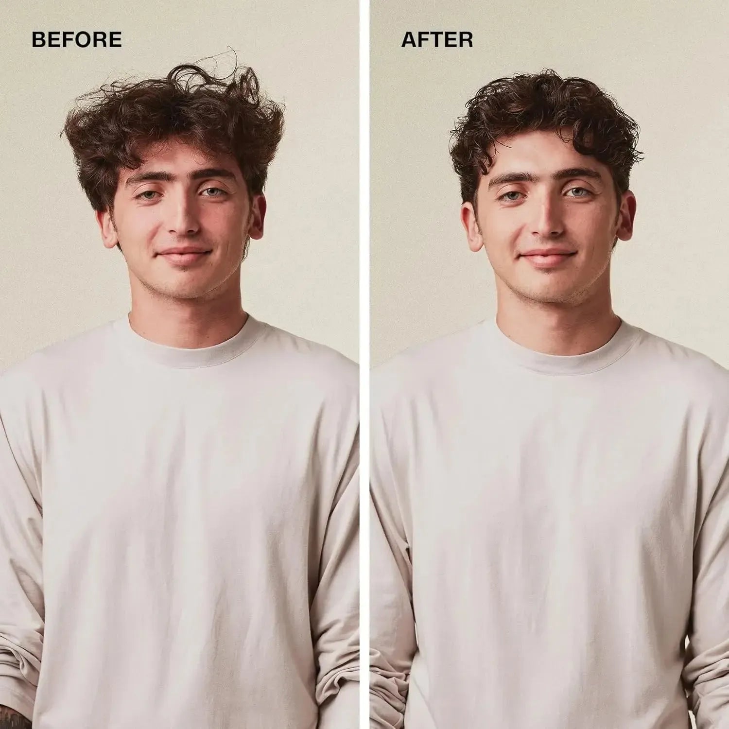 Work a small amount into your hands and distribute through damp or dry hair