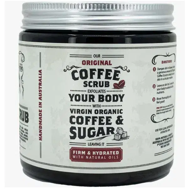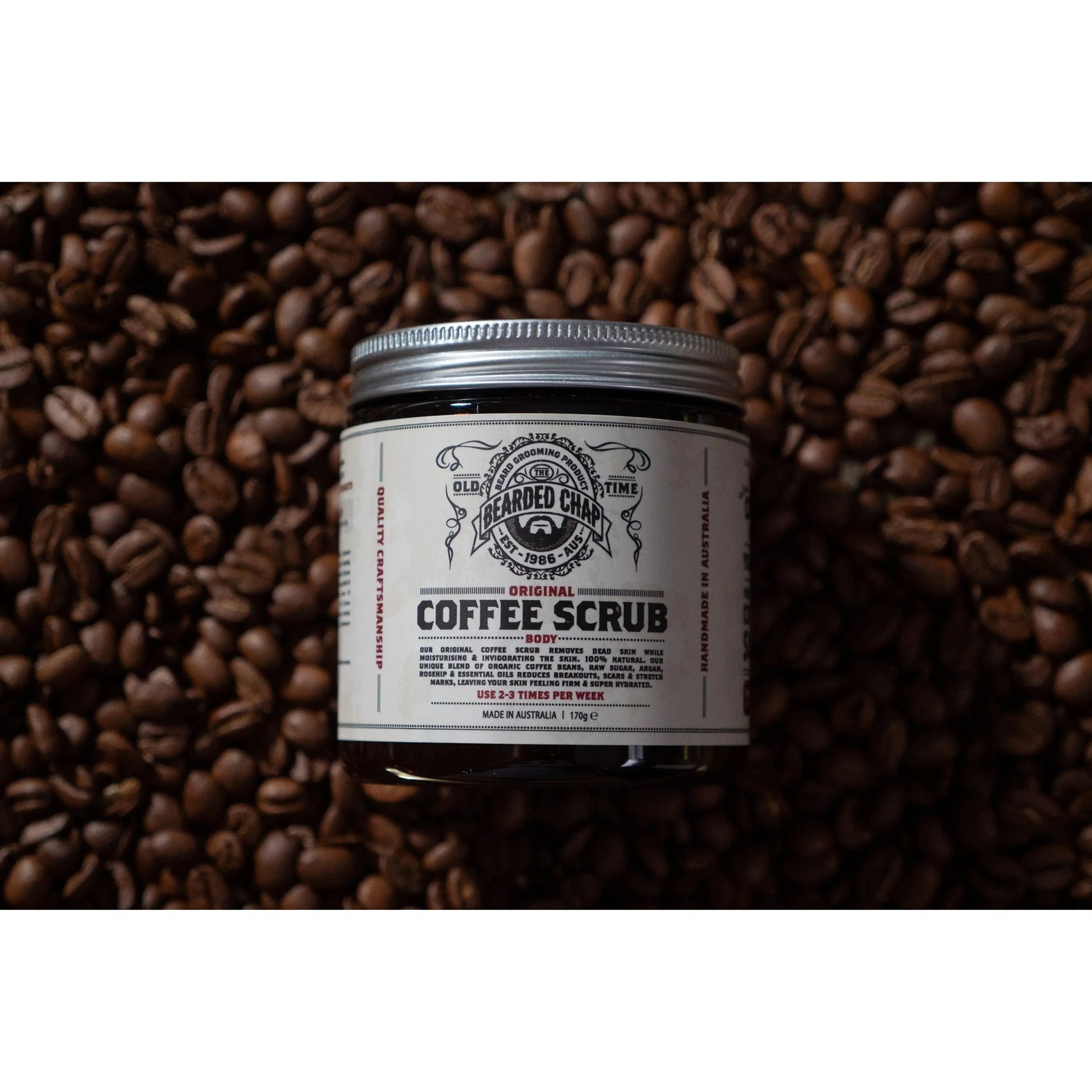 The Bearded Chap Original Coffee Scrub is for those who want to exfoliate and invigorate their skin. Made from natural ingredients and a unique blend of certified organic Peruvian virgin coffee, Queensland raw sugar, certified organic Argan Oil, Rosehip Oil and essential oils. This moisturizing coffee scrub helps reduce breakouts, scars, and stretch marks to leave your skin feeling firm and super hydrated. Designed to be used all over your body to help restore and regenerate your skin. Features a masculine scent of cinnamon, peppermint, lavender, and lemon myrtle essential oils.